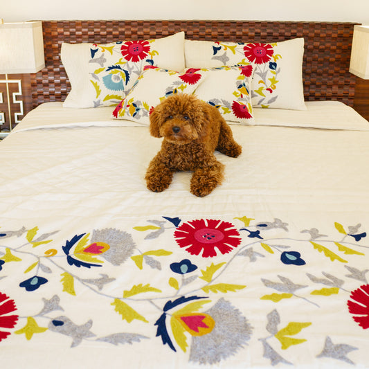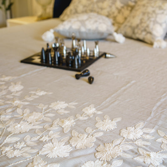 CREAM LINEN BEDCOVER WITH MULTI-FLORAL EMBROIDERY