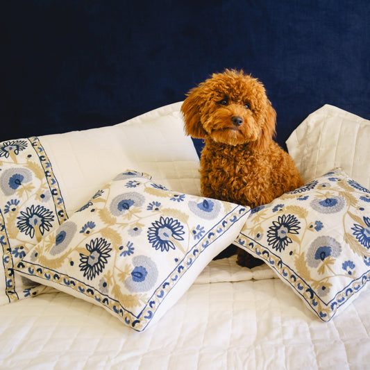 KASHMIRI WHITE LINEN BEDCOVER WITH BLUE EMBROIDERY