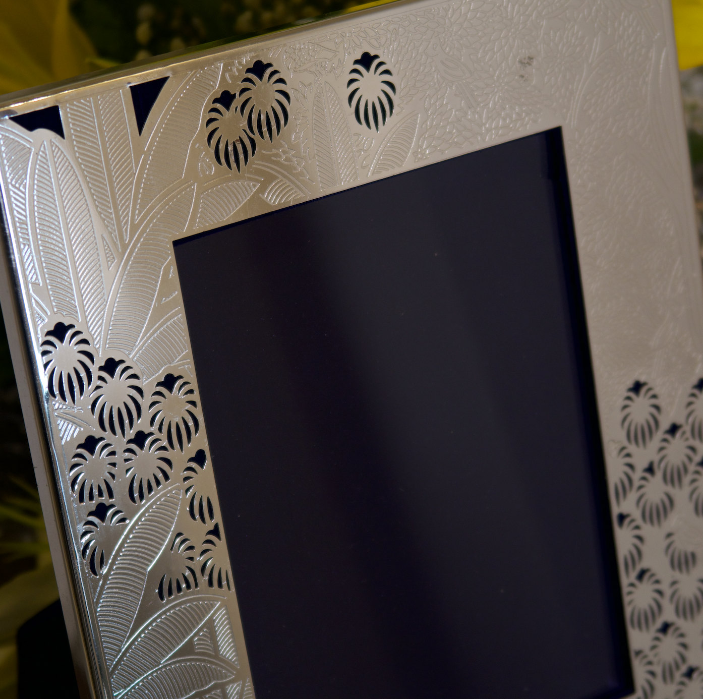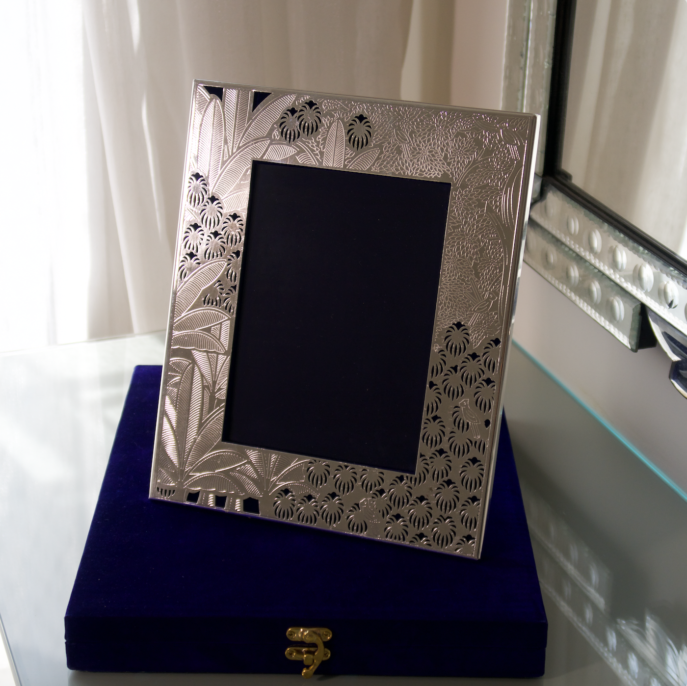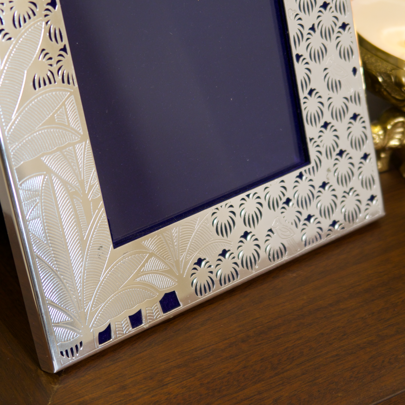 The Palm Trees Photo Frame, with its silver-toned finish, is the perfect backdrop for vacation memories or moments that remind you of summer.