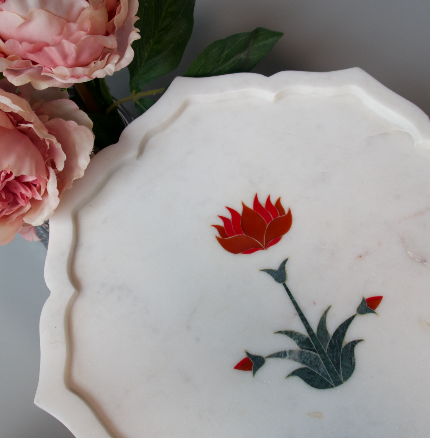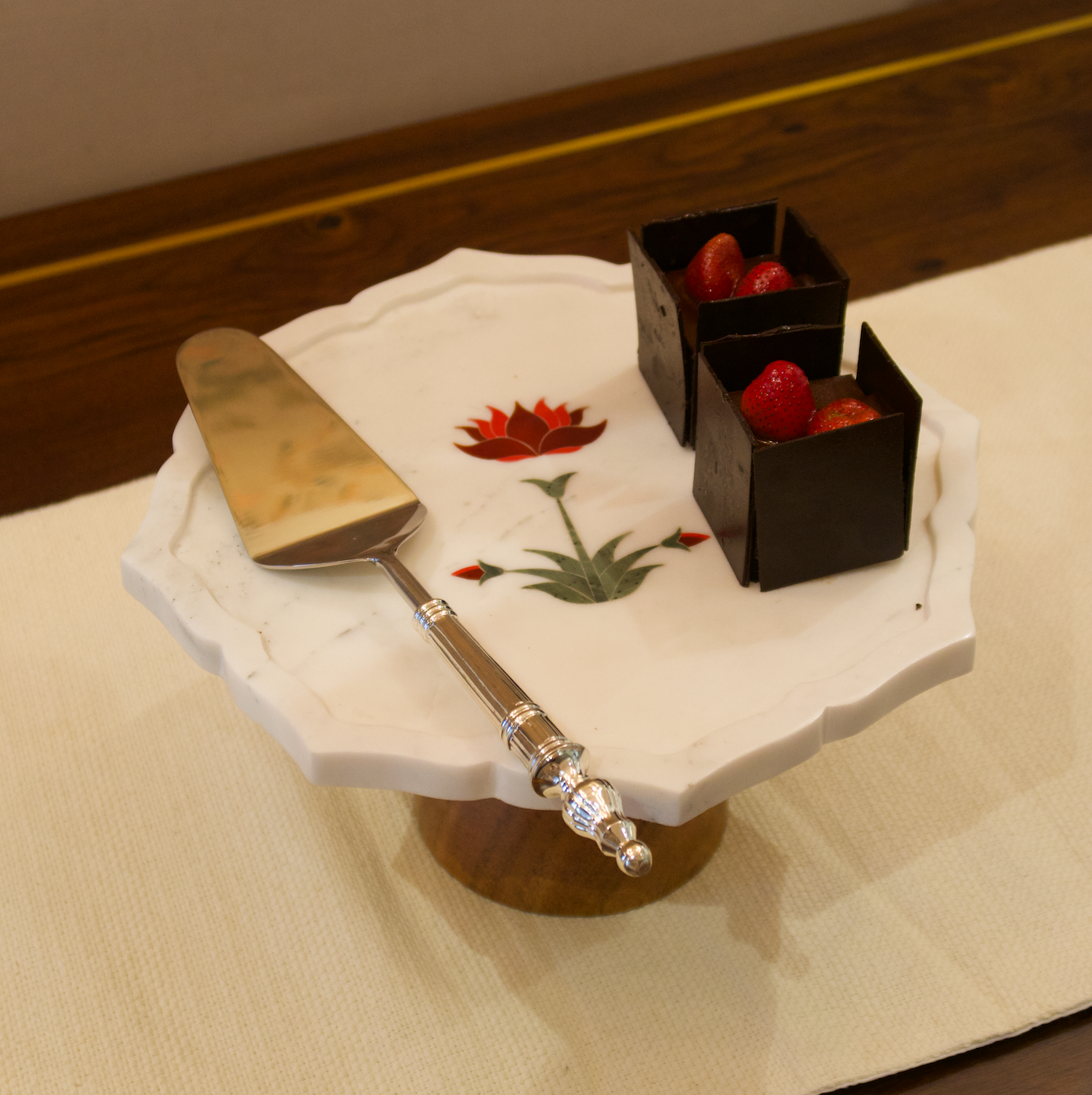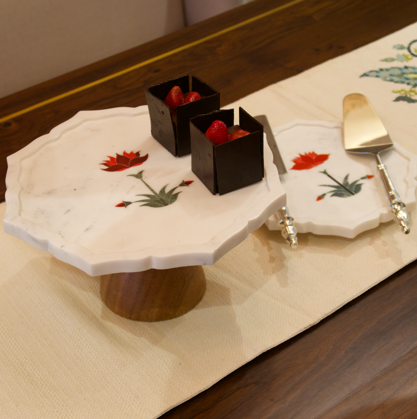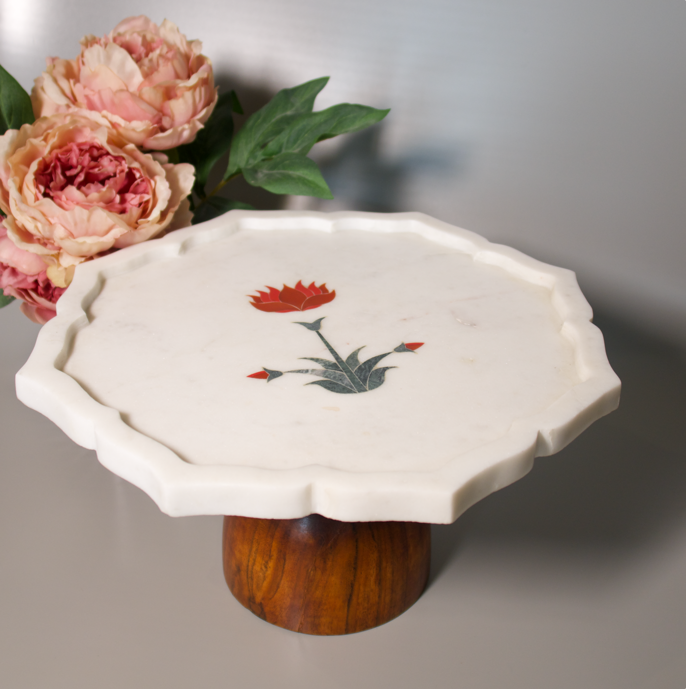 Crafted from pure marble with intricate red floral inlay and a sturdy wooden base, this cake stand is where timeless design meets everyday function. Whether you are serving desserts or using it as a centerpiece, it adds effortless charm to any table—no extra styling needed.
